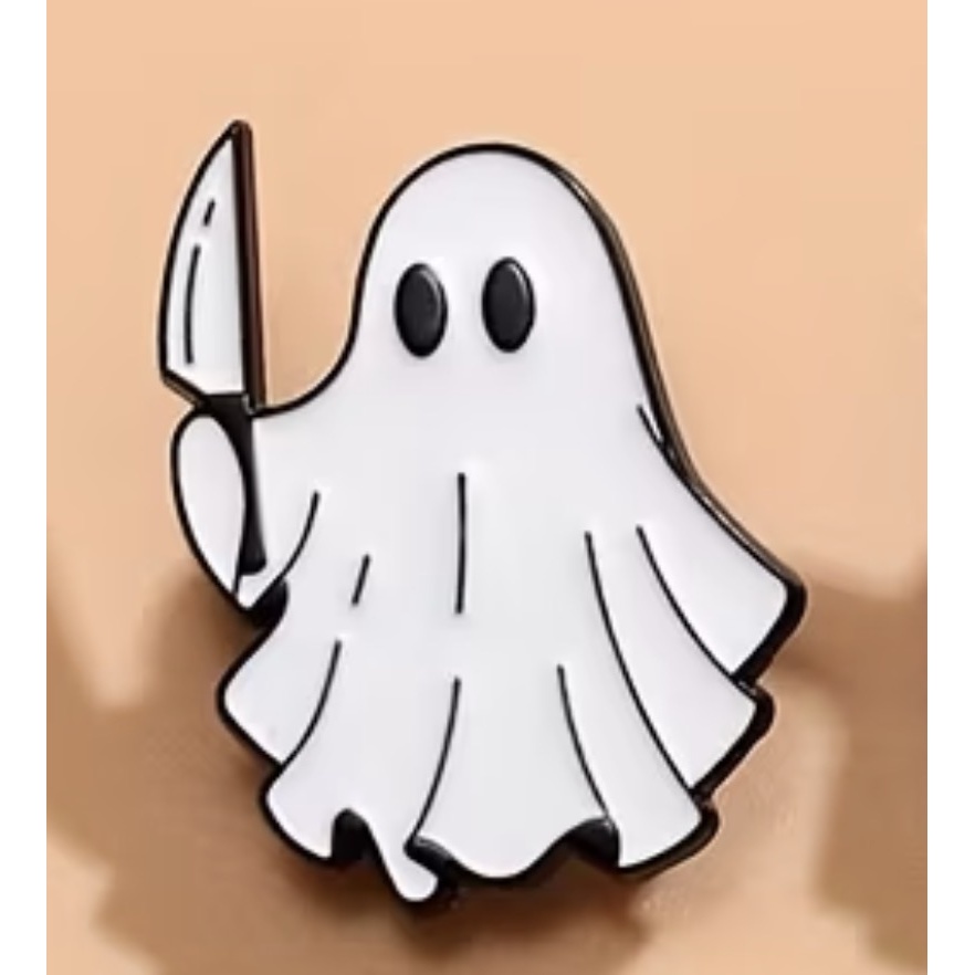 Add some spooky edge to your collection with this enamel pin featuring a ghost wielding a knife. This adorable yet mischievous ghost combines cute charm with a dash of danger, making it a fun accessory for Halloween or any day you feel a little edgy. Pin it to jackets, bags or backpacks for a conversation starter that shows off your playful side.