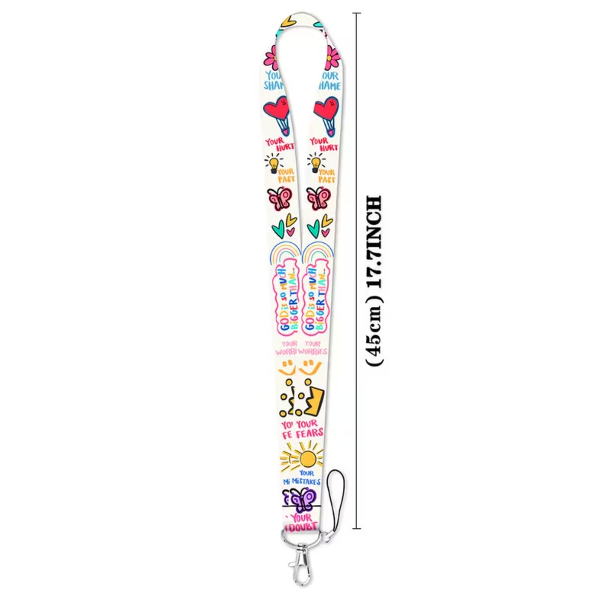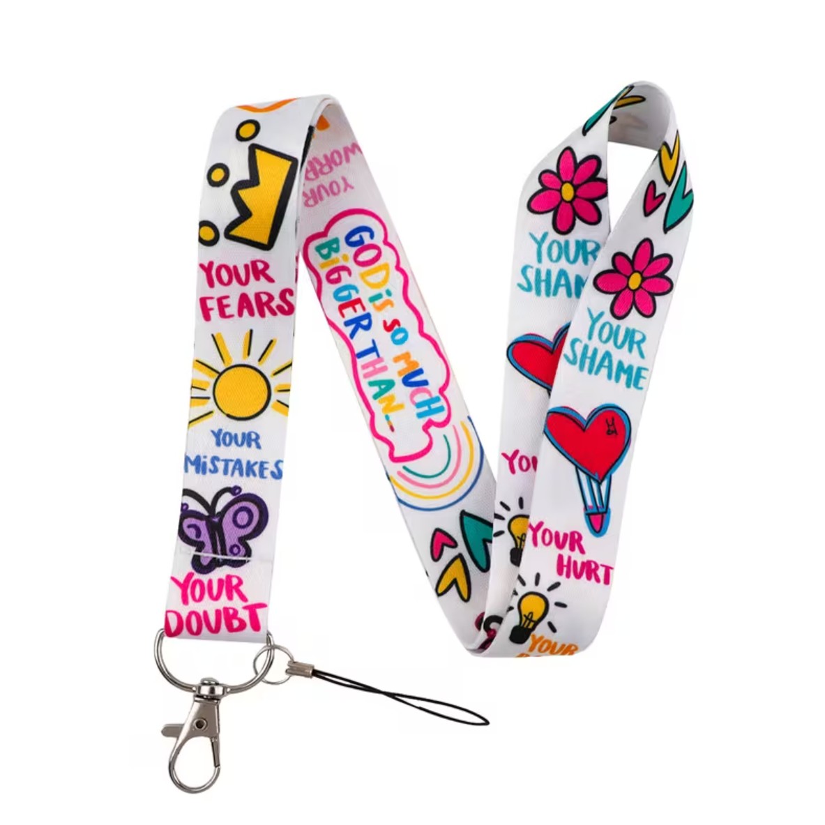 Colorful lanyard with inspirational message “God is bigger than your fears, mistakes, and doubts.”
