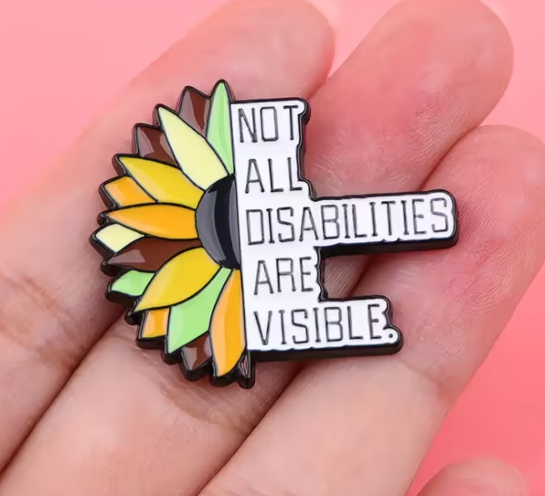 Awareness enamel pin with sunflower design and “Not All Disabilities Are Visible” message. A meaningful accessory that promotes understanding.