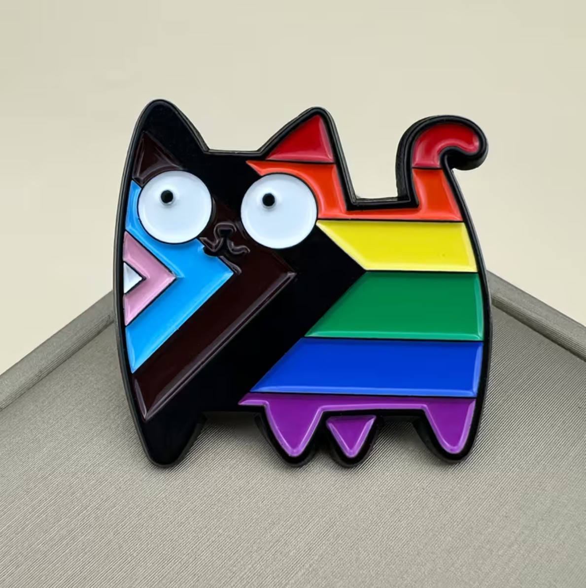 Add a splash of color and personality to your style with this vibrant rainbow pride cat enamel pin. Featuring a playful wide-eyed cat design filled with bold rainbow stripes and pride-inspired colors, this pin is a fun and expressive way to show support and individuality.