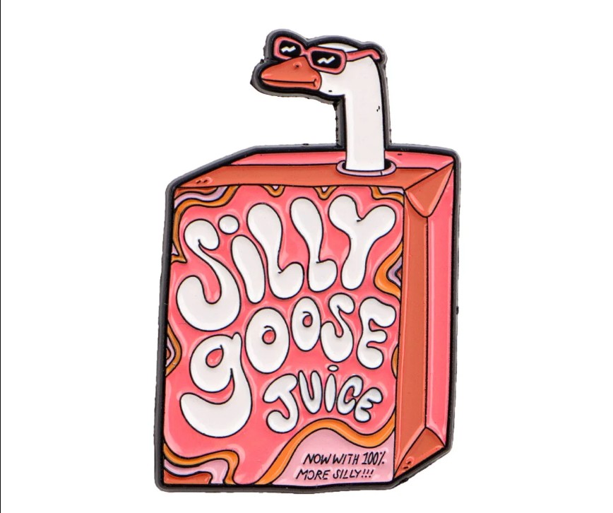 Bring some playful chaos to your style with this “Silly Goose Juice” enamel pin. Featuring a quirky goose popping out of a retro-style juice box, this design is full of humor and personality.